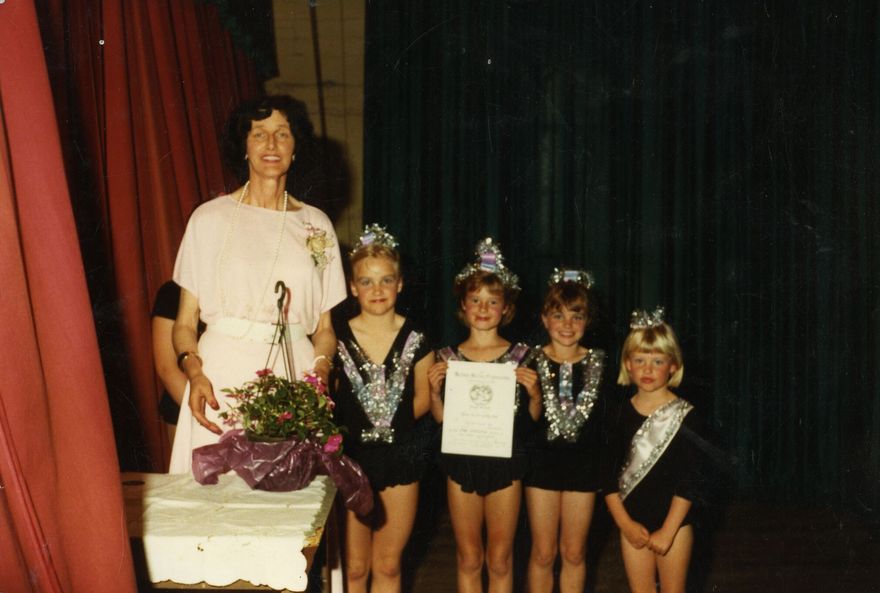 The well-known Palmerston North dance teacher Zona Broughton stands beside four dance students who are holding a certificate.