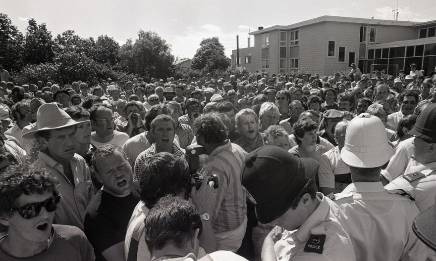 This series of images was taken for a story that ran in on the front page of The Manawatu Evening Standard on 10 February, 1987. The story pertains to the mortgagee auction of a farm owned by Paul Geurtjens of Bulls. Up to 700 protesters attended the auction at Harcourts real estate on Fitzherbert Avenue. Auction proceedings were interrupted by protesters placing false bids and drowning out proceedings. The property was not sold as it didn’t raise a bid. The images of Longburn workers protesting appear on the same roll of film, however it is unclear if theese are from the same event.