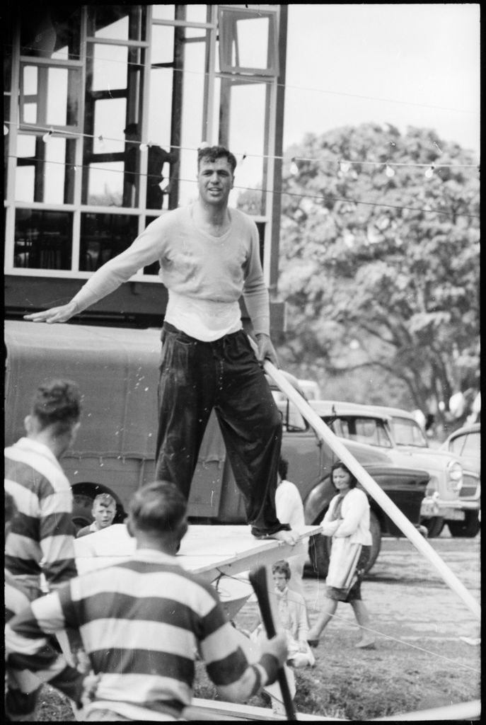 This image was not published in The Manawatu Evening Standard, taken on 21 January, 1964. "During the jousting tournament for the "wooden spoon" at the Carnival of the Lake, between Army and the "Kouncil Knights" disaster overtook the City Council crew. Coming in to attack, they turned broadside on and were dealt a mortal blow by Army. A thunderflash, thrown into the water, exploded under the keel and blew a hole in the plates. looking like a submarine diving, the gondola sank in a dignified dive, leaving the crew floundering in the lake. Navy divers and the Army soon salvaged the stricken vessel." See Also: 2017N_2017-20_018340, 2017N_2017-20_018342, 2017N_2017-20_018343, 2017N_2017-20_018344