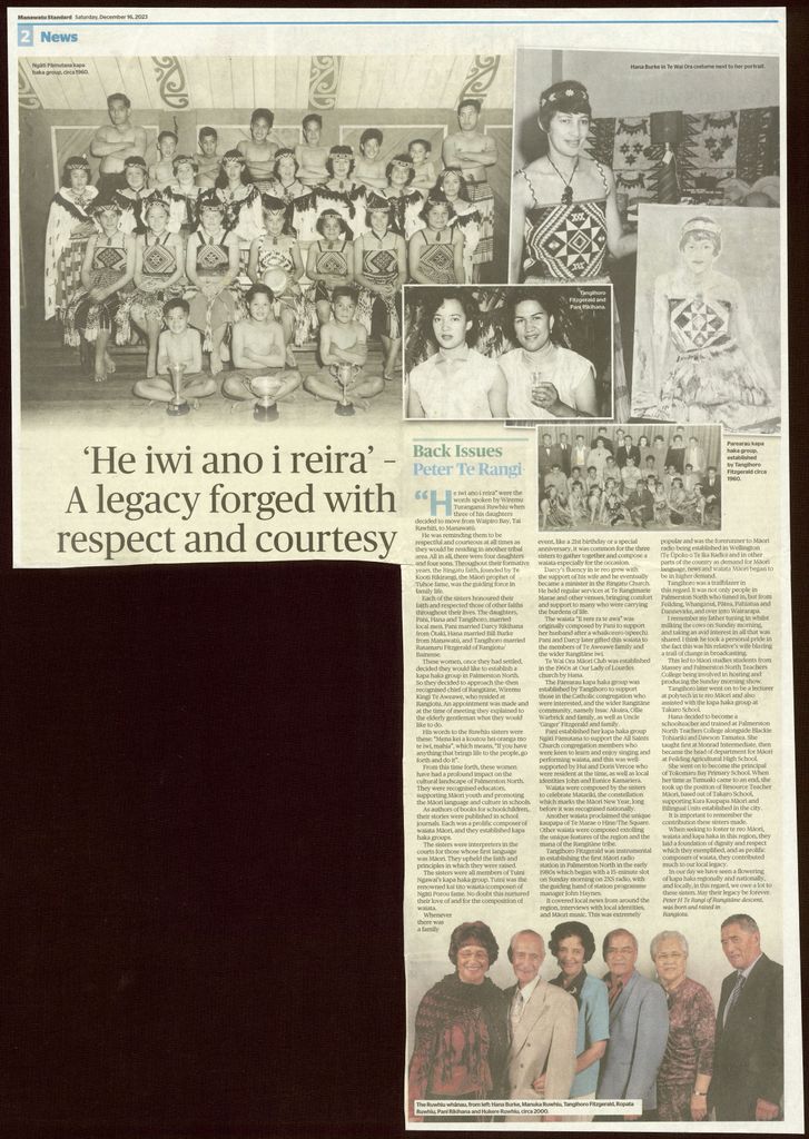 - Local historians weekly "Back Issues" article in the Manawatū Standard. Three daughters of Wiremu Turanganui Ruwhiu established kapa haka groups in the Manawatū in the early 1960s. Pani Rikihana, Hana Burke and Tangihoro Fitzgerald contributed significantly, promoting te reo Māori and Māori culture in schools. The sisters were prolific composers of waiata Māori, interpreters and recognised educators supporting Māori youth. They had a profound effect on the cultural landscape of Palmerston North.