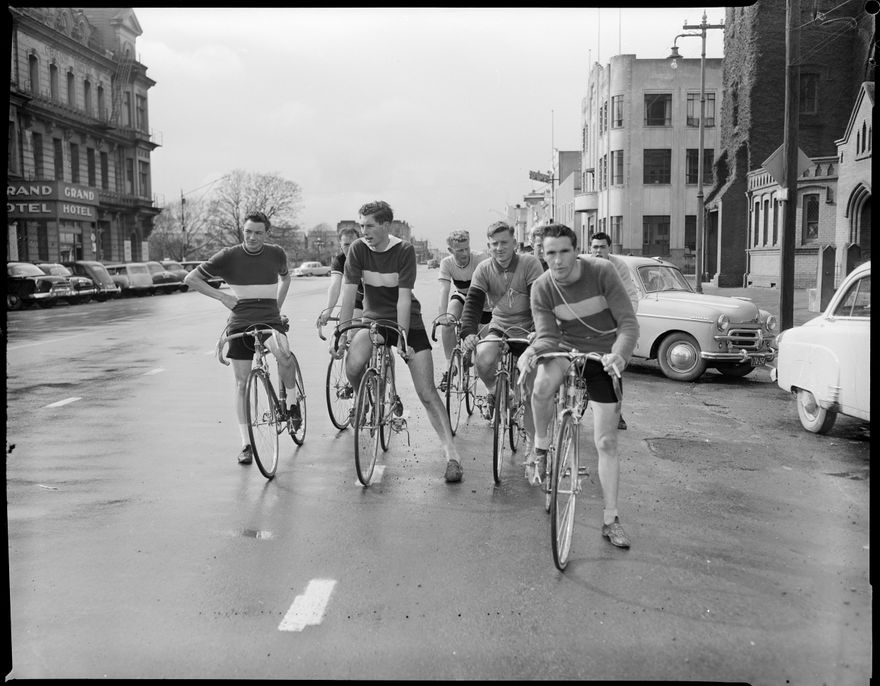 This image was taken for a story that ran in The Manawatu Evening Standard on 17 August, 1959. "The amateur cycling race from Palmerston North to Levin and return was conducted on Saturday by the Palmerston North Amateur Cycling Club. The senior riders are seen prior to leaving."
