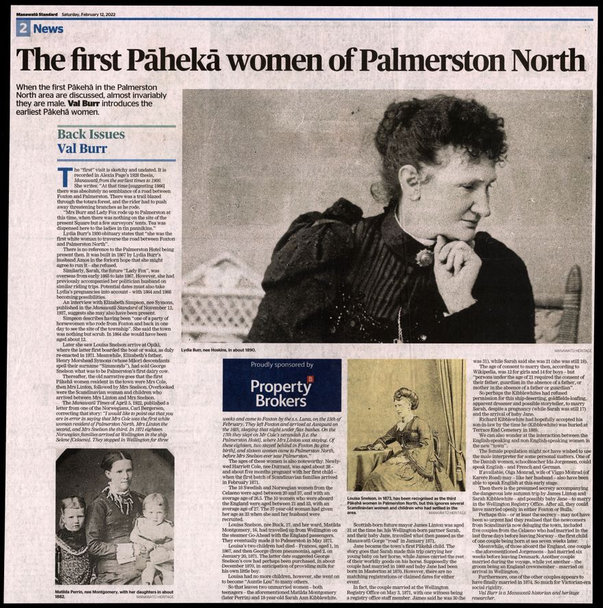 Local historians weekly "Back Issues" article in the Manawatū Standard. The earliest that Pākehā women arrived in Palmerston North was believed to be in 1866, when some travelled through totara forest from Foxton. Although Louisa Snelson has been recognised as the third Pākehā women in Palmerston North in 1873, a group of Scandinavian women came before her. This article tells the immigration story of these earliest Scandanavian settlers. It also includes the stories of Lydia Burr née Hoskins, Matilda Perrin née Montgomery, Louisa Snelson, Sarah Linton née Kibblewhite and Harriette Cole née Durrant.