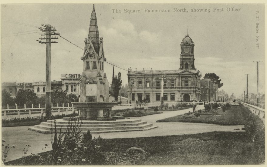 This postcard shows the King Edward VII Coronation Memorial Fountain, also known as the Coronation Monument. It was built in 1902 to mark the coronation of Edward VII. In 1925, it was combined with another feature of The Square, the concrete fish pond. The monument was moved in 2005 to the corner of The Square nearest to Broadway Avenue. To the right of the fountain is the old Post Office. A new Post Office for Palmerston North was completed and opened in 1906, on the site of previous one, on the corner of Main Street and The Square. The building was later extended along Main Street, and the tower was removed after the 1942 Wairarapa earthquake, as it was considered unsafe. The clock and chimes were put into storage until reinstated in a clock tower in The Square, which was completed in 1957. It now operates as a cafe and bar.