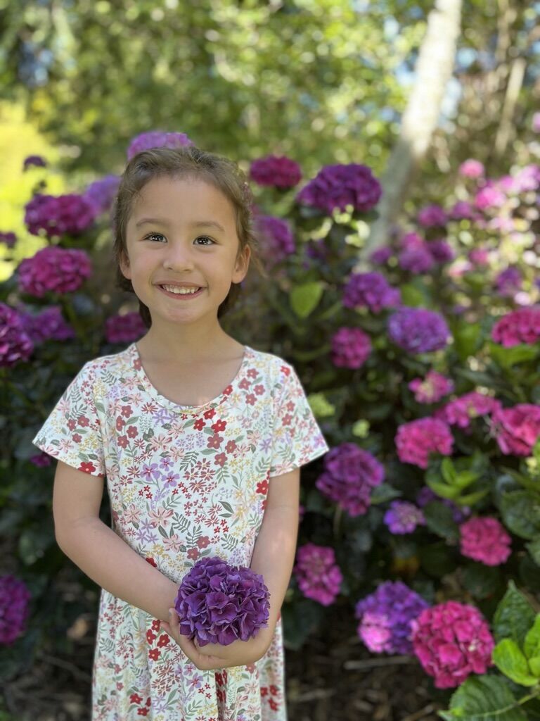 My granddaughter visited from Hamilton and posed for the photo because she thought they were pretty. I explained to her best not to pick the flowers but to enjoy them with your eyes.
