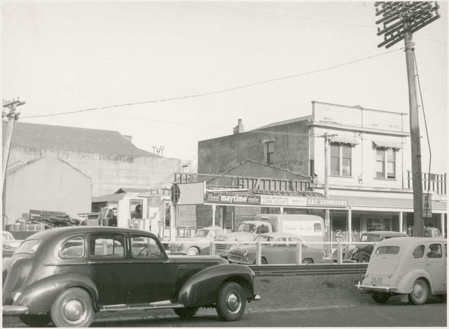 This series of images depicts the development of the site at the corner of The Square and Main Street (east) over the period of 17 June 1963 – 5 April 1965. During this time these existing buildings including the former Municipal Council Offices/Third Public Library the former Manawatū Evening Standard offices, and the corner retail building) were demolished to make way for the construction of a new public library. The public library was officially opened on 4 November 1965. This photograph shows the frontage onto Main Street. The railway line which ran down Main Street until 1964 can be seen behind the cars in the foreground.