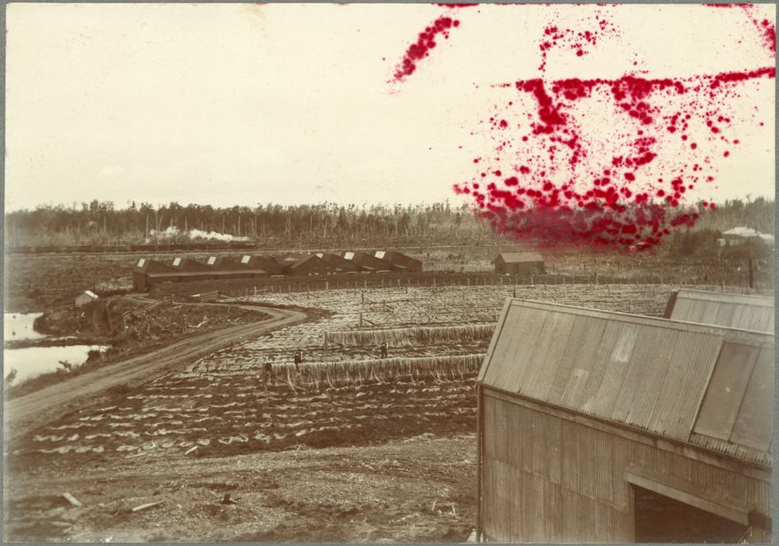 This view looks westwards from the top of the scutching shed. The stripping shed is in the middle distance. The train going by in the distance is on the main railway line between Shannon - Linton.