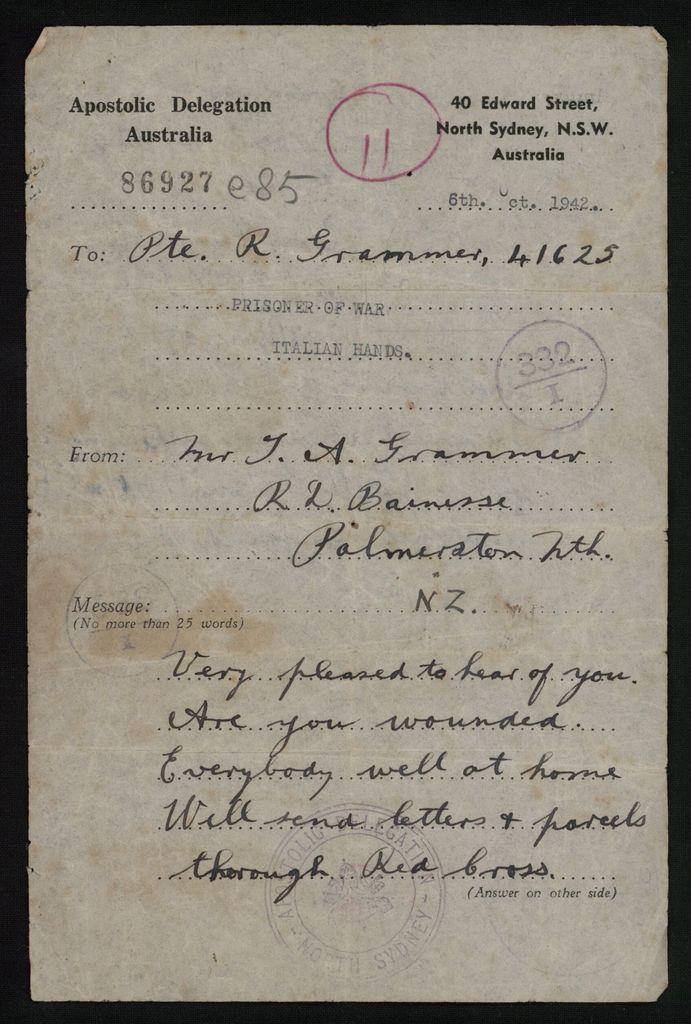 This letter was written by Mr Tom A. Grammer to his son Ronald Grammer when he was a prisoner of war in Italy, 1942. The second page contains a reply from Ron.