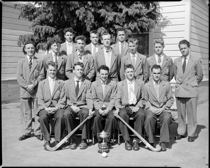 A group of fifteen male students at the Palmerston North Teachers' College pose with hockey sticks and a trophy. This negative comes from the Elmar Collection - a large series of semi-identified and unidentified images from the 1930s-1970s.