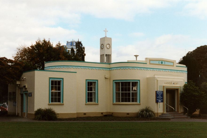 The Ladies Rest Rooms were built in the art deco style in 1936 and stand on the site of the original ladies’ toilets which had opened in 1918. Built in the wake of the Napier earthquake, the rest rooms followed strict building regulations including steel reinforced concrete and were fitted out in the finest kauri, heart rimu, totara and matai joinery. In keeping with the code of decency of the day, these facilities were totally separate from the men’s toilets. Feeding, changing and rest rooms, as well as toilets, were provided, although the bath that was a feature of the original women’s toilets was not included. Female attendants were a feature of the rest rooms for many years, supplying a friendly face and welcoming environment. “Spending a penny” meant just that since a 1d slot machine was installed as a tariff for users. This charge was abandoned when decimalization was introduced in 1967. In 2004, after much debate, an information centre and unisex toilets were added to the Ladies Rest. The mother’s room is now a parent’s room and a shower and other facilities have been added.
