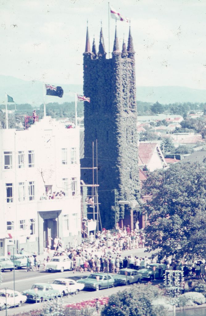 A picture of the corner of the Square showing All Saint's Church (covered in ivy) and the old City Council building (now Square Edge) The crowds are gathered waiting for the Centenary parade to begin.