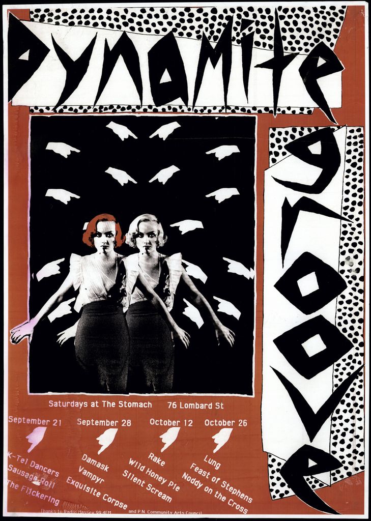 Dynamite Groove. Saturdays at The Stomach 76 Lombard Street. September 21 K-Tel Dancers, Sausage Roll, The Fl1ckering. September 28 Damask, Vampyr, Exquisite Corpse. October 12 Rake, Wild Honey Pie, Silent Scream. October 26 Lung, Feast of Stephens, Noddy on the Cross. Part of a collection of posters that were displayed at The Stomach, Lombard Street, venue for Creative Sounds Society Incorporated.