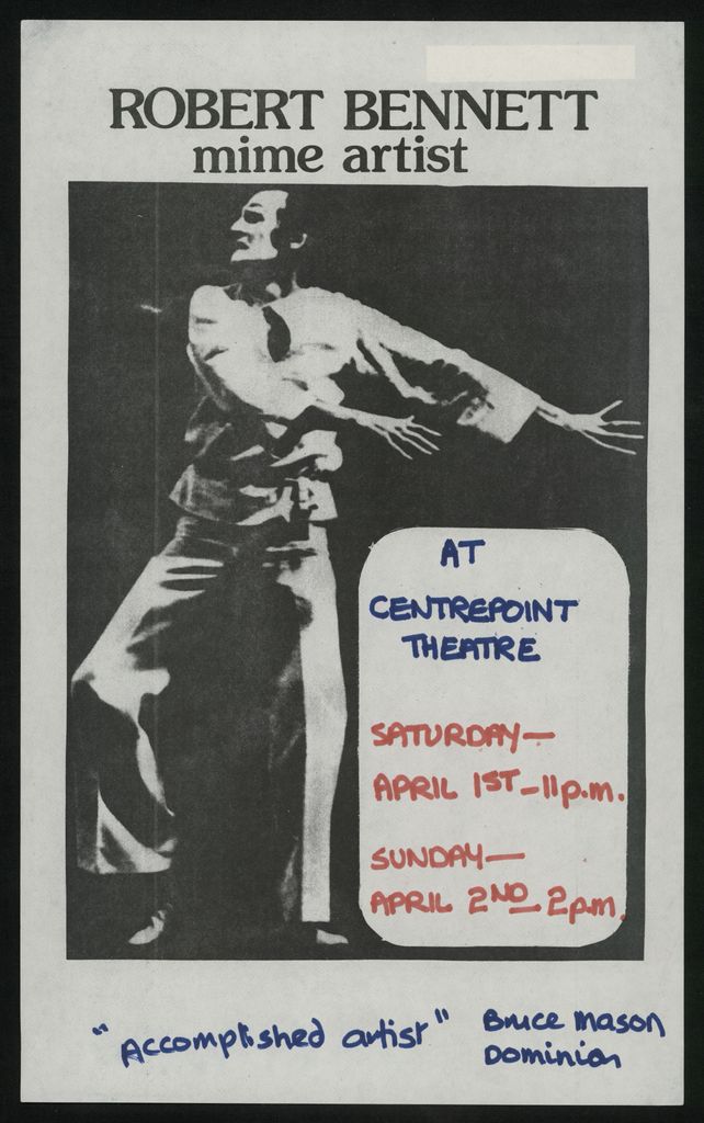 "Robert Bennett mime artist. At Centrepoint Theatre. Saturday - April 1st - 11pm. Sunday - April 2nd - 2pm. "Accomplished artist" Bruce Mason, Dominion." Part of a collection of posters that were displayed in the Public Library in the 1970s - 1980s.