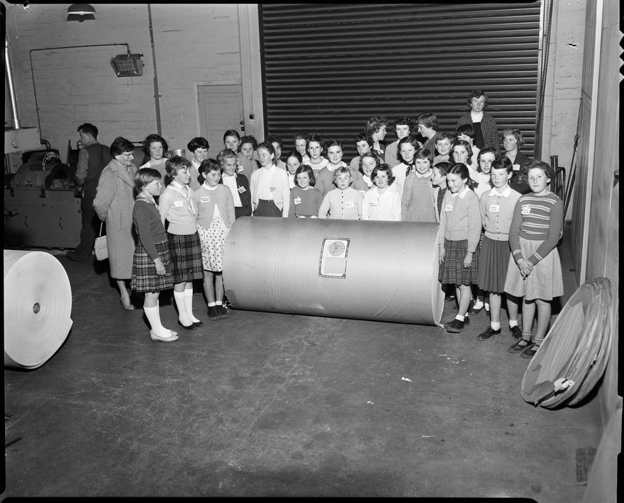 This image was taken for a story that ran in The Manawatu Evening Standard on 31 August 1960 "These children from the stay-at-home camp being held by the Y.W.C.A. in the city are looking at a large roll of newsprint outside the press room of the "Manawatu Standard". The "Standard" was one of a number of business houses which received a visit from these children."