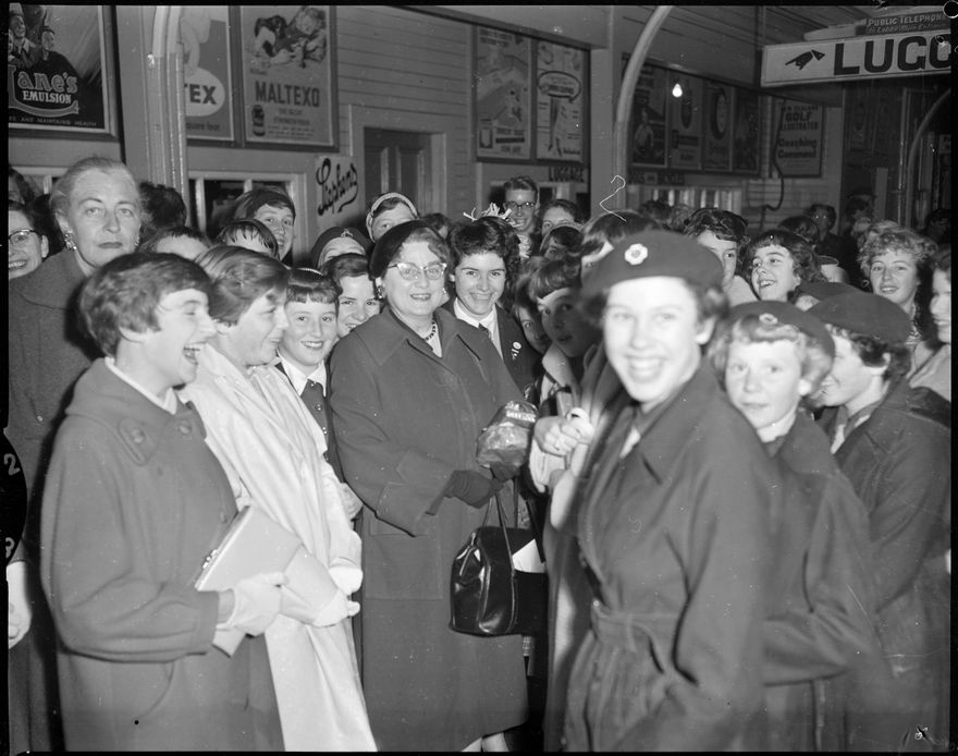 This image was not published in The Manawatu Evening Standard, taken on 8 August, 1959. "A farewell from Palmerston North Girls' High School pupils was given to Mrs D. Smith, an American exchange teacher at the Palmerston North Railway Station last night." Another photo associated with this article was published on the same day and on the 6 August.