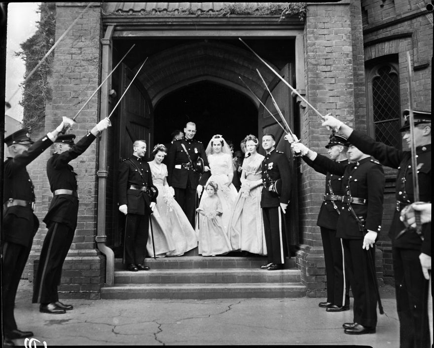 This image was taken for a story that ran in The Manawatu Evening Standard on 3 June, 1963. "Lieutenant A. W. Ancell and Mrs Ancell and attendants leaving All Saints' Church after their wedding on Saturday. The military guard of honour was formed by fellow officers of the bridegroom from Linton Military Camp. The bride was formerly Miss C. E. Taylor, of Palmerston North."