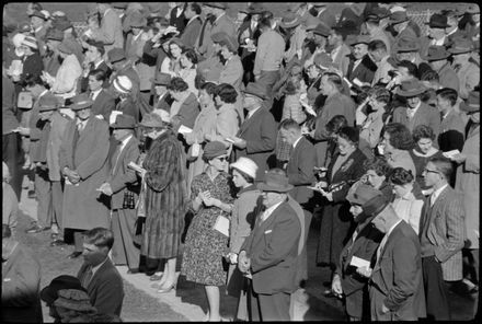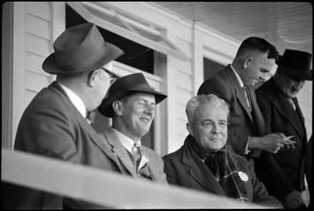 The annual race meeting of 1907. The Ashhurst-Pohangina Racing Club was formed on 1 August 1891 and the first race meeting was held on 29 Dec 1891 on land leased at Otangaki Flat [Ashhurst]. The photograph shows the Steward’s Stand, the Main Stand centre and the Tote at the 1907 annual meeting held on Anniversary Day, 22 January.