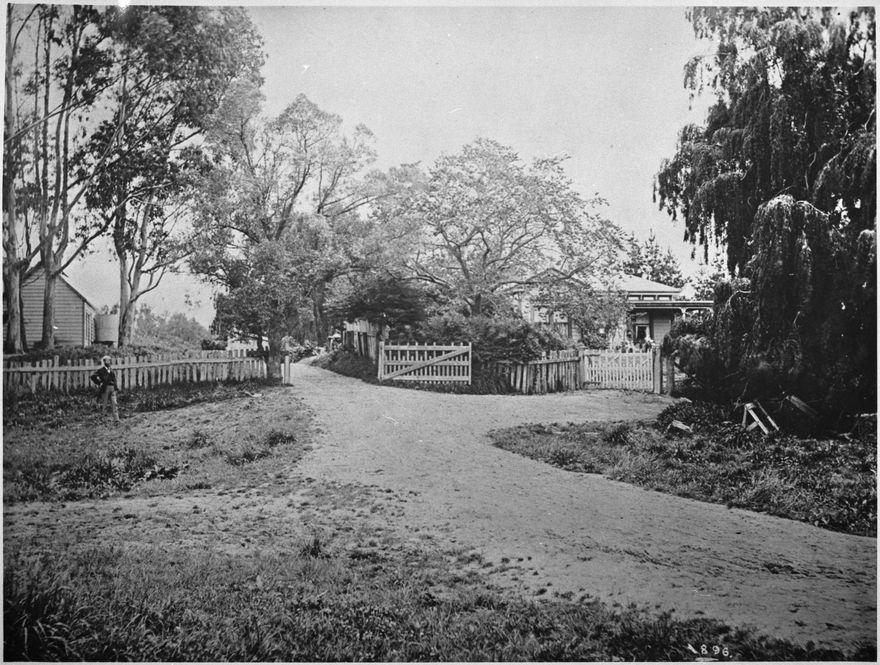 This photograph shows the second Monrad house at Karere, constructed after the first house as destroyed by fire in 1889. In 1896 the house was owned by Ditlev and Oscar Monrad.This building was one of the first European houses in inland Manawatu, erected 1867 by European carpenters employed by Ditlev Gothard Monrad, the Lutheran Bishop and ex-Premier of Denmark who settled at Karere in 1866. The house was occupied by the Bishop and his wife 1867 - 1868 and then by one of the Bishop's sons, Viggo, 1868 - 1885. A verandah and extra ground-floor rooms were added to the house about 1880.Written on the rear of the photograph: ”To the left of the house is partly visible the store, which is on posts. The stave fence carries on down to the other fence. You can see between the big tree and whare a yard, but now we will change the left part from the fence to the store into a hen run. The open window is our bedroom, the two middle ones the living room, the left one the guest room. Above my room is Louise’s, the remainder still open space with a couple of windows. The door leads into a passage. To the right of the house is a gate leading into a yard. To the right of the whare stands raspberry bushes, then potatoes….etc”.