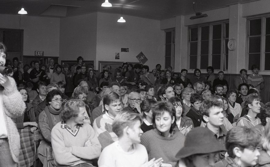 Some of the 300-strong audience who filled the YMCA hall in Palmerston North last night to hear speakers, including Wellington Central MP Fran Wilde … support the Homosexual Law Reform Bill.”