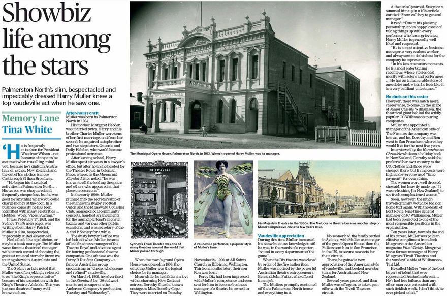 Journalist Tina White's weekly "Memory Lane" article in the Manawatū Standard. The career of Theatre Royal's business manager and first Opera House manager Harry Muller.