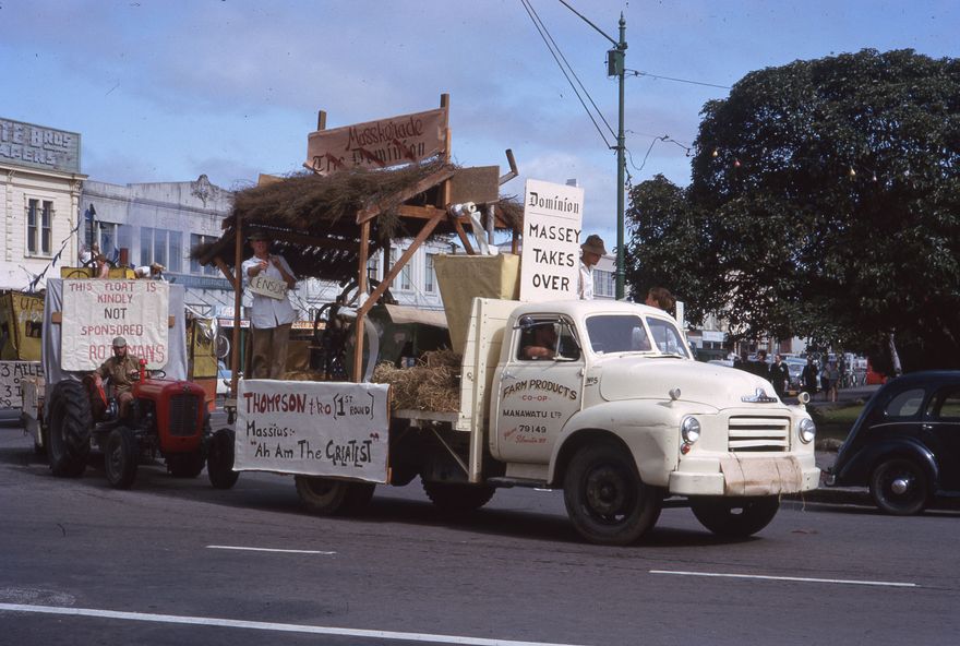 The annual Student procession or 'Procesh' was held at midday on the Monday of 'Capping Week' and was a highlight of 'Town and Gown' relations between Massey University and the City. Sometimes courting controversy with its 'student humour', the parade usually consisted of floats, clowns and trick cyclists. It attracted large crowds, stopping traffic along Broadway and around the Square and usually ended with a ceremonial ducking in the Butterfly pond after speeches by students representing 'Lord and Lady Massey' and the Mayor.