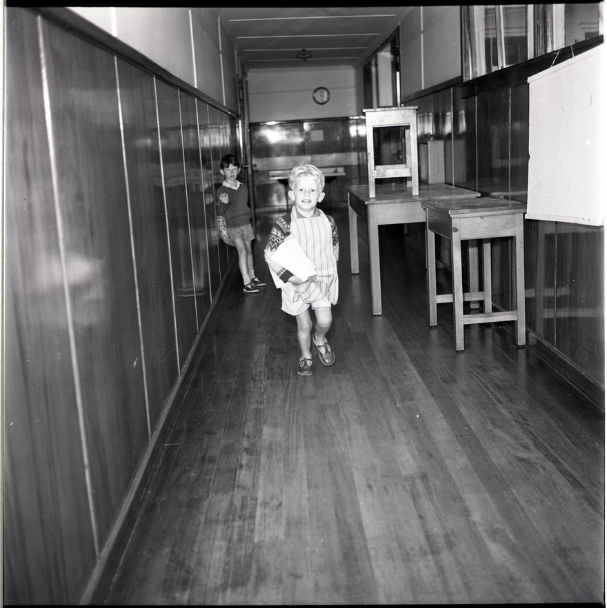 This photograph ran with the caption, "Tuesday February 6, 1968 was the first day at primary school for many Palmerston North children. Here's one five year old walking to class at College Street School."