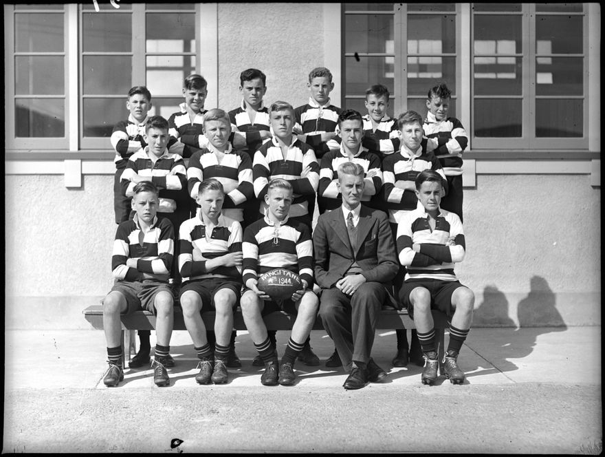 'Rangitāne' rugby team group photograph. Palmerston North Intermediate Normal was established in 1941 and is located at 300 Ferguson Street.