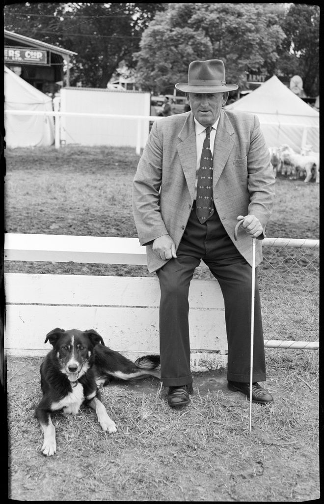 This image was taken for a story that ran in The Manawatu Evening Standard on 9 November, 1959. "Resting in between sheep-dog trials at the Royal Show on Saturday are Mr E. Morrow, of Rahotu, and his three-year-old musterer Scott."