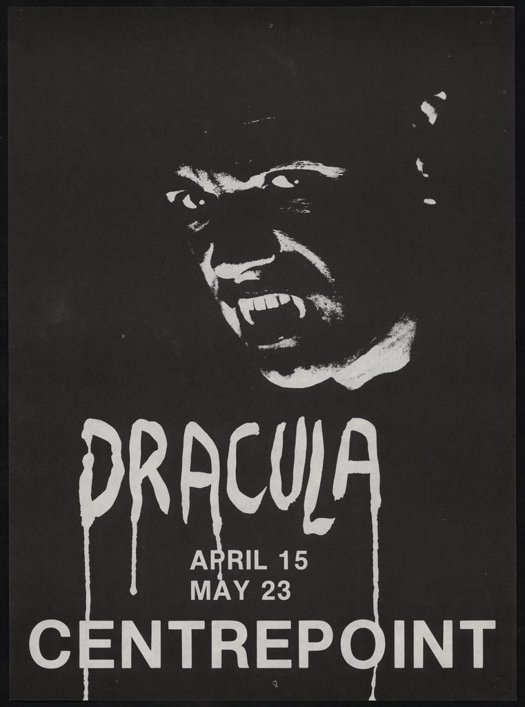 "Dracula April 15 May 23. Centrepoint." Part of a collection of posters that were displayed in the Public Library in the 1970s - 1980s.