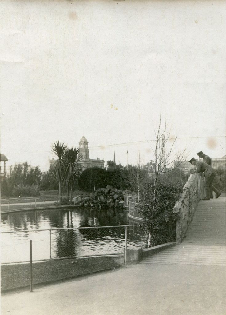 Lakelet in the Square, looking towards the Post Office, with the bridge on the right and – just visible on the left – part of the second bandstand. The two figures on the bridge look as if they may be soldiers. The picture was sent by Jane Moore Chapman to her grand-daughter Beryl with a message on the back that indicates it was written in 1922.
