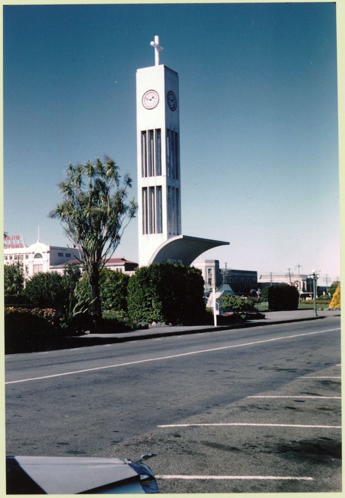 The clock in the Clock Tower, named Kerei Te Panau after a local Rangitane chieftain, was originally housed in the Chief Post Office of Palmerston North. Due to safety concerns both the tower and clock were removed from the Post Office after the 1942 Wairarapa earthquake, and the clock placed in storage. In 1953 Arthur Hopwood gifted the city of Palmerston North £10,000 to build a new tower in The Square to hold the clock and chimes. It was completed in 1957. The Clock Tower has experienced a number of changes including the removal of the original sound shell at the base of the tower in the early 1990s and the addition of a cross (both features are visible in this image). During 2007 the Clock Tower was refurbished and it is now topped with a lantern style cross.