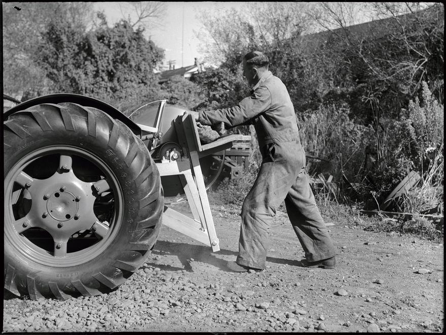 This tractor has been adapted to operate a wood splitter which has attached to the rear of the tractor. Shown here is a workman demonstrating the adaptation.