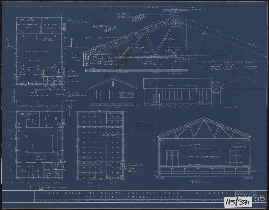Blueprint of The First Church of Christ Scientist with drawings for the new Sunday School Building. Contains setting out and electrical plan; foundation plan; front and side elevation.