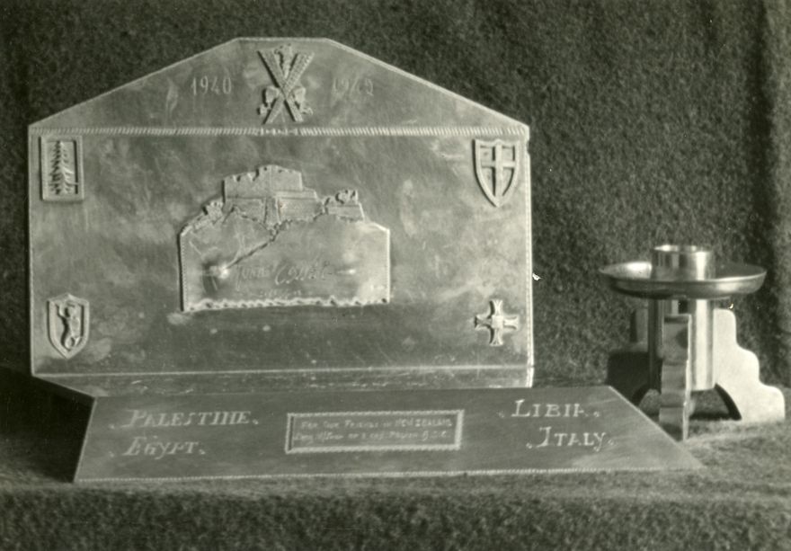 A paperweight, with Monte Cassino in relief in white metal, and a canon shell. On the paperweight is inscribed " 1940 to 1945", "Monte Cassino 1944" and "Workshop Platoon". The base also has a plaque, "For our friends in New Zealand from Work Shop of 3 Coy Polish A.S.C." and is inscribed "Palestine, Egypt, Libia, Italy". Monte Cassino was the site in the Italian campaign during World War Two. These were two of the gifts made by Polish soldiers to give to New Zealand as an expression of their heartfelt gratitude for New Zealand's treatment of the Polish children refugees and appreciation of the great friendship shown to the soldiers through the sending of correspondence and parcels, during World War Two. This item is held by Te Manawa, Palmertson North.
