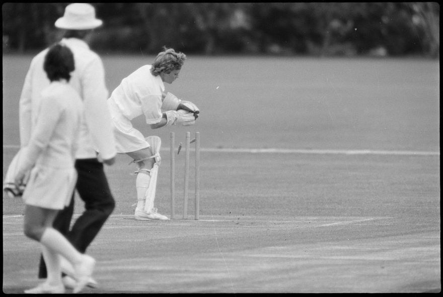 This image was taken (but not used) by the Evening Standard on 19th of January 1982. It depicts the Manawatū women’s cricket team taking on the Australian women’s team in a limited over warm-up match for the Hansell's Vita Fresh Women's World Cup 1981/1982. The match was held at Ongley Park in Palmerston North. The Australian team won by 202 runs. The match report ‘Aussies too polished in all facets’ was written by Ford Watson and published the next day: