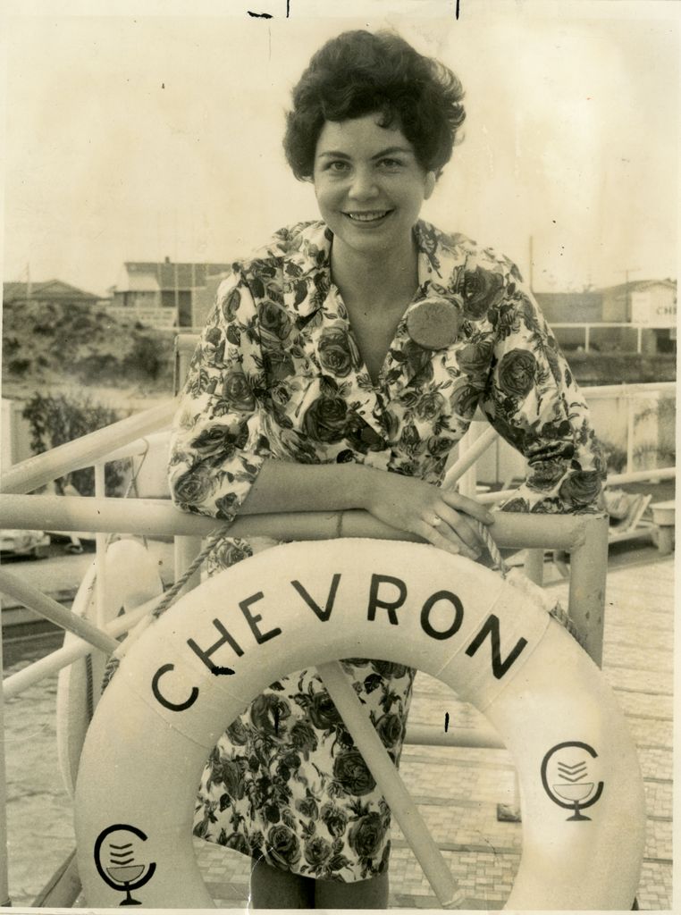 Helen Wilson, winner of Miss Industries, 1960, poses on a jetty.
