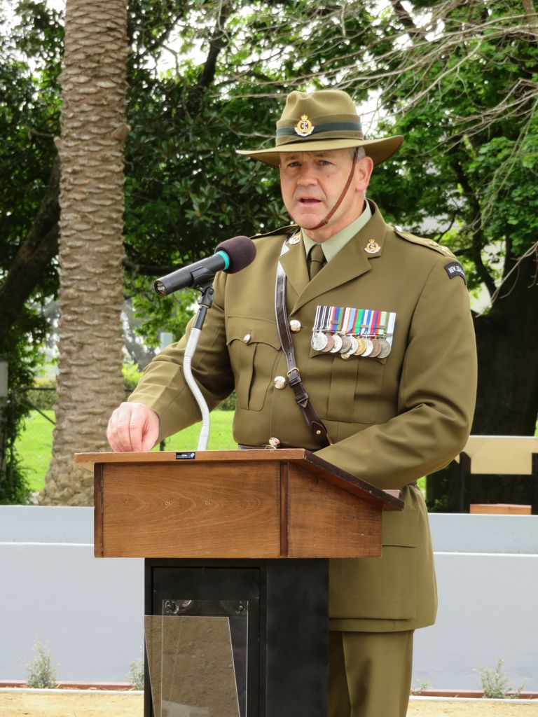 The Awapuni Memorial at the Palmerston North Racecourse was rededicated after its refurbishment, on 20 October 2016. The memorial was originally erected at the Race course in 1929, to commemorate the New Zealand Medical Corps, who trained there ahead of deployment in World War One. After falling into disrepair a project to restore it began in 2014, at a cost of $200,000. The Royal New Zealand Army Medical Corps established the project team, with Palmerston North City Council and Awapuni Racing Centre. Lieutenant Colonel Darren Beck speaks at the ceremony.