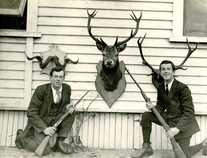 Thomas (b.1897) and Ernest (b.1901) Davis were the sons of James and Harriet Davis who farmed in the Tiritea/Fitzhbert area c1897-1910, after which they moved into the Palmerston North. The boys were 'outdoors men', interested in hunting and fishing. Thomas later became a carpenter-builder in Wellington and Ernest a building inspector.