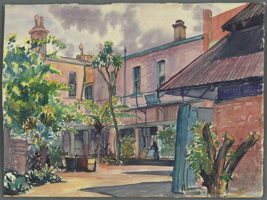 Painting of a man working in the courtyard of the Club Hotel, Palmerston North, which operated on the Church Street side of The Square. The courtyard was a 'beer garden' in a garden setting.
