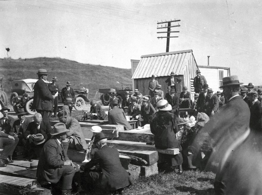 Shown here is a function conducted by the Manawatu Board of Control regarding the widening and straightening of the Manawatu Gorge road. Mr J.A. Nash is standing on the left holding notes, and seem to be addressign the group.