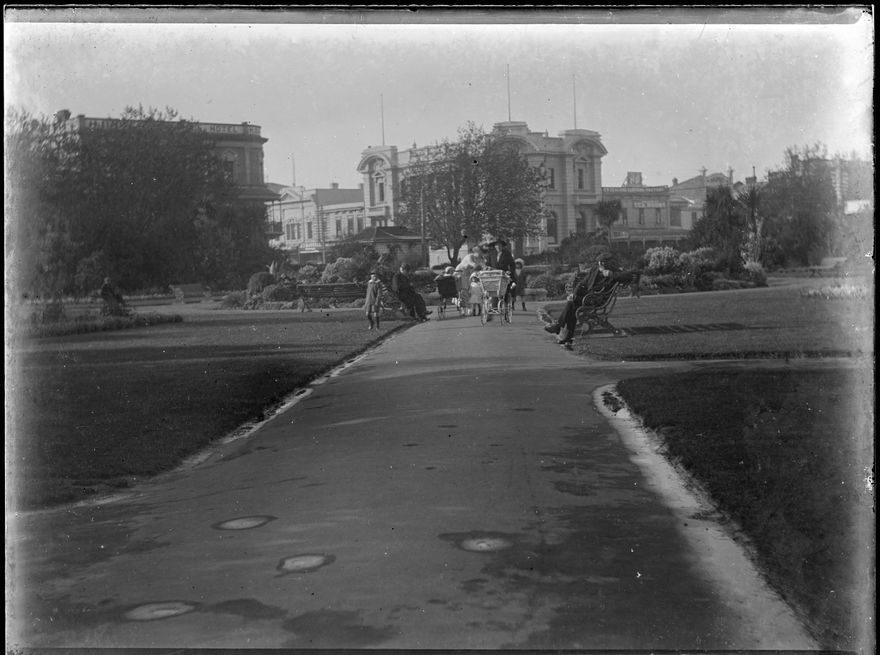 This image is believed to have been taken by Palmerston North Engineer Frank (Frances Leslie) Berry. It features an outing of women and children in the Square, looking towards the Bank of New Zealand on the corner of Rangitikei Street.