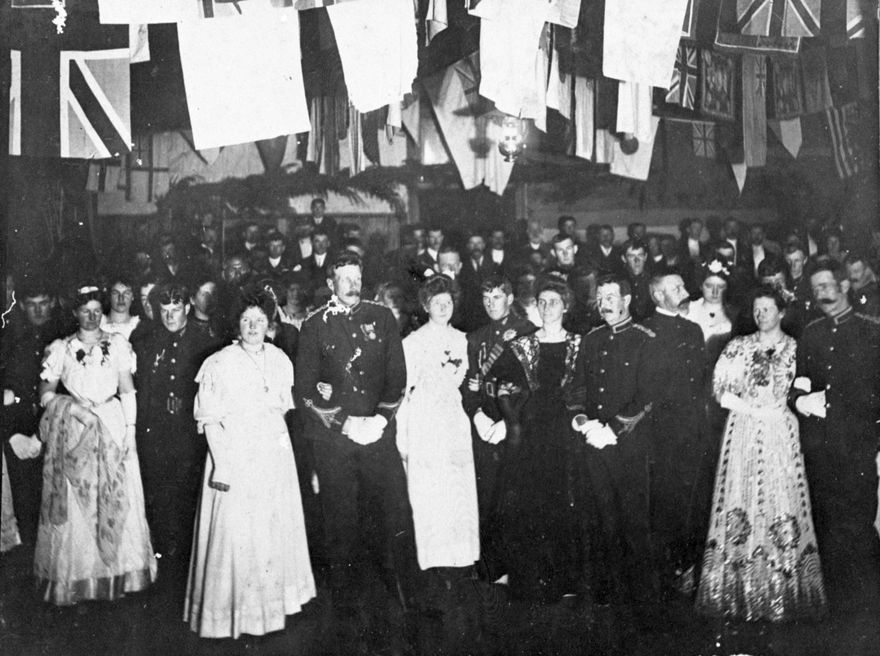 Guests at the ball are standing in the decorated hall. Major William George Ashworth and Mrs Ashworth are 4th & 5th from the right.