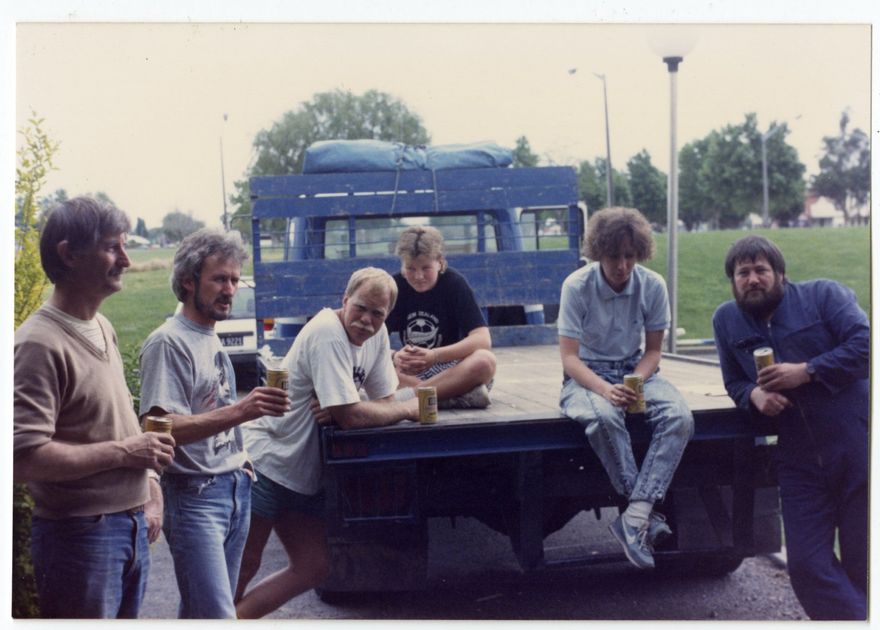 Some of the Manawatu Theatre Society Stage Crew relax after a day of set construction. Front left: Doug Mawson, Charles Forbes, unidentified, Rhys Doherty, Lynette Russell and Bernie O'Donnell