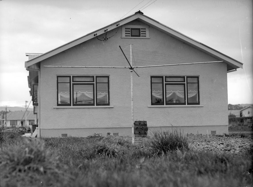 This photograph shows a side view of an unidentified house. A revolving clothes line is also visible.