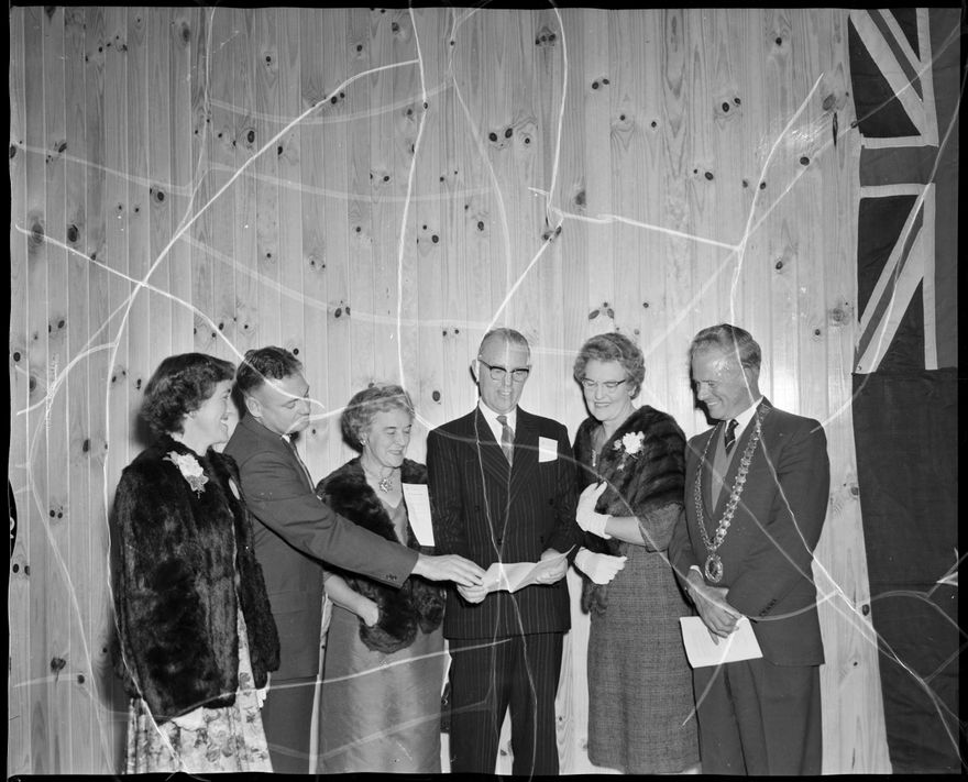This image was taken for a story that ran in The Manawatu Evening Standard on 24 April 1961 "Surveying the weekend programme for the Terrace End Rotary Club's forum are principal personalities at the function. From left: Mrs., J. Death, Mr. Death, the president of the Terrace End Club; Mrs. J.K. Hunn; Mr. Hunn, the secretary for Maori Affairs) ; Mrs. A . Brown and Mr. Brown, at the District Governor of Rotary (Wanganui) who presided."