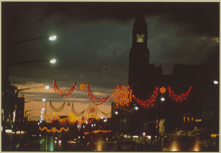 In 1970, to mark Palmerston North's centennial, the Council arranged to purchase a section of the 1969 Light of London Christmas decorations from Regent Street. Ten lines of lights were purchased at a cost of £2,820 - 9 lines consisting of 1 large centre star, 2 reflector stars and 4 triple drapes. The 10th line was a shield based on the Palmerston North coat of arms. The lines were placed on Broadway Avenue, Rangitikei Street and in the Square. The coat of arms was in Fitzherbert Avenue. It cost $3000 per year to power the lights. They were taken down in March of 1972 for refurbishing and put up for Christmas in 1972-1974. However, the lights were expensive to maintain and they have not been used since [2014].