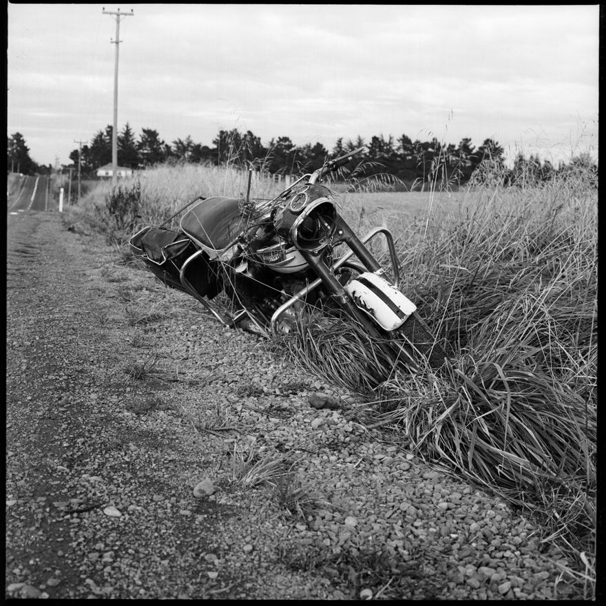 This image was taken for a story that ran in The Manawatu Evening Standard on 29 February, 1964. "This motor-cycle belongs to Mr. Kevin John Hill, now seriously ill with multiple head injuries at Palmerston North Hospital. Mr. Hill, a 24-year-old Regular New Zealand Army sapper based at Linton Camp, was travelling towards Palmerston North when the accident happened this morning. Police believe Hill lost control of his machine (report page 12)."
