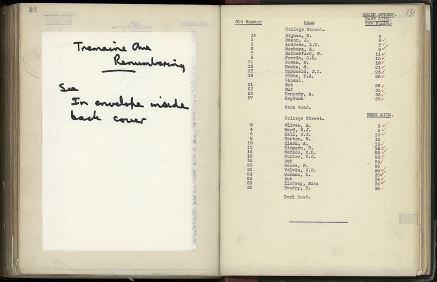 This rates register details the renumbering of street numbers in Palmerston North between 1936 and 1939. The register shows the street name, old number, owner of property and new number. The renumbering runs along the entirety of one side of the street, then the other, on an east-west and north-south axis. It also includes notes on specific properties and streets that were subsequently renumbered after the creation of the register, documenting changes made up until 1980.