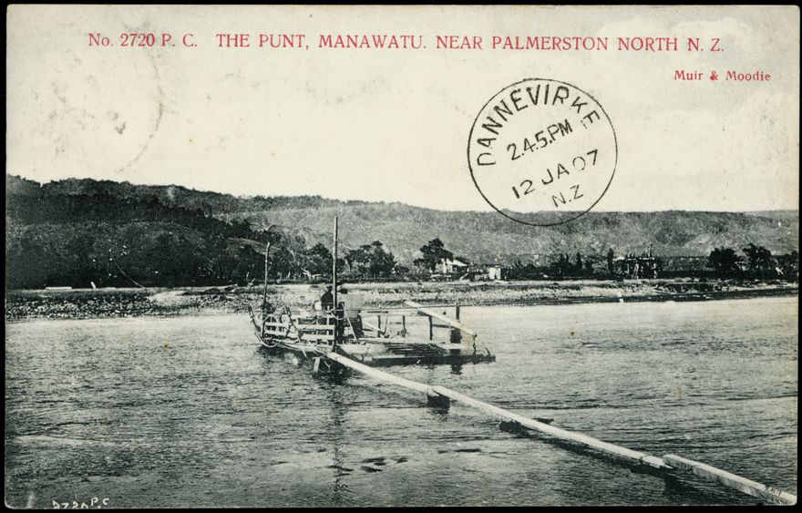 A punt operated from from 1871 to 1886, at which point the first wooden bridge across the river was built. The postcard is looking towards the Tararua Ranges.