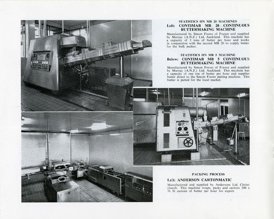 The Manawatū Co-operative Dairy Company Ltd was established in 1960 following the merger of the Awahuri and Rongotea Co-Operative Dairy Companies. To cope with the enlarged intake of milk and cream a continuous butter making system was planned and a new butter factory was opened in 1968. At the time, it was the third largest dairy co-operative in New Zealand, having an ultimate capacity of 20,000 tons of butter a year, a whole milk capacity of 3000, 000 gallons of milk daily and production value of $11,000,000 annually. This booklet lists the Board of Directors, provides and history of the company, details the new continuous butter making system, and gives an overview of the facility.