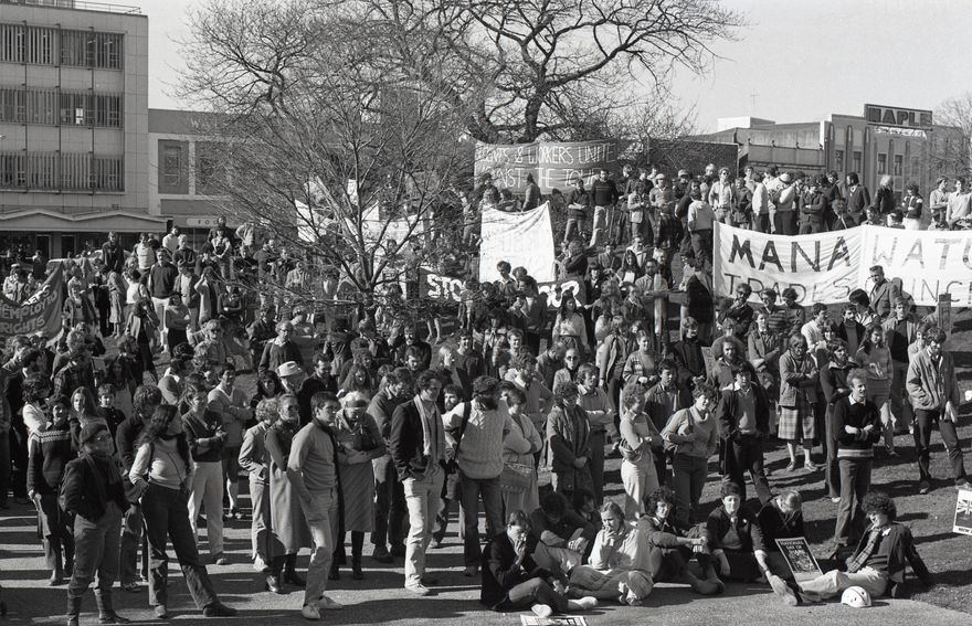 This image was taken (but not used) for a story that ran in The Manawatu Evening Standard on 22 July 1981, with the caption: "Half mast flag marks 'shame' day: Palmerston North's anti-tour protestors marked New Zealand's 'National Day of Shame' with a peaceful march through the central City." The 'Day of Shame' march was the largest of several protest events before and after the Springbok Rubgy team played Manawatū in Palmerston North in 1 August 1981. The March moved from St Patrick's cathedral, down Broadway Avenue, circled the Square, ending in the 'Lion's Den' quadrant. 500 demonstrators began the march but the numbers may have swelled to 1000 by its end. The protesters were occasionally heckled by pro-tour members of the public. March chants included "Don't scrum with racist scum", and "We don't want your racist tour".